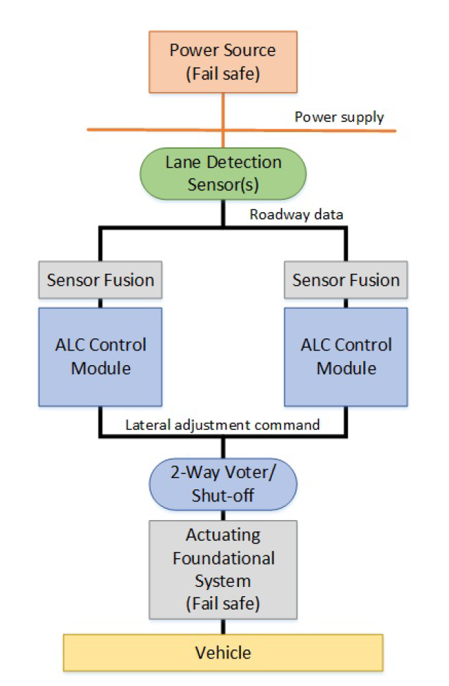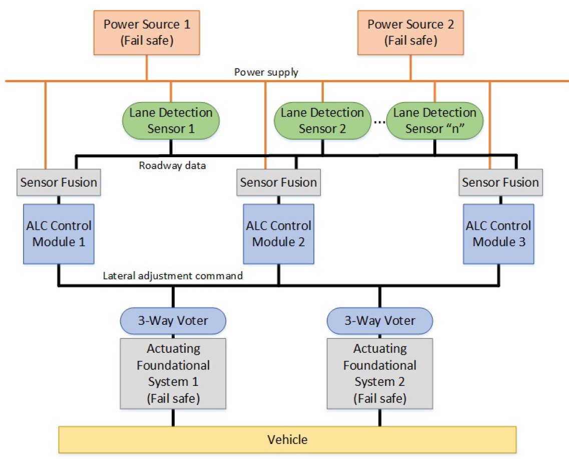 - 결함 허용(Fault Tolerance): 하나의 결함만으로 곧바로 안전 목표가 위배되지 않도록, 시스템에 여유도나 백업을 두는 것입니다. 예를 들어 중요 센서 입력은 이중화하거나 교차검증해야 하며, 주요 연산은 두 개의 독립된 프로세서에서 수행하여 하나가 고장나도 다른 하나가 조향 제어를 지속하도록 설계해야 한다는 요구사항이 제시되었습니다. 이는 특히 ASIL D로 분류된 목표(SG2 등)를 만족하기 위해 필수적인 전략입니다. 보고서 그림에서는 이를 위해 ALC 제어모듈을 두 개 두고 투표기(voter)로 검증하는 이중화 예시가 제시되기도 했습니다(이에 대해서는 뒤에 더 설명).